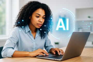 Woman working on laptop with AI interface icon glowing beside her in modern indoor setting, symbolizing artificial intelligence technology concept.