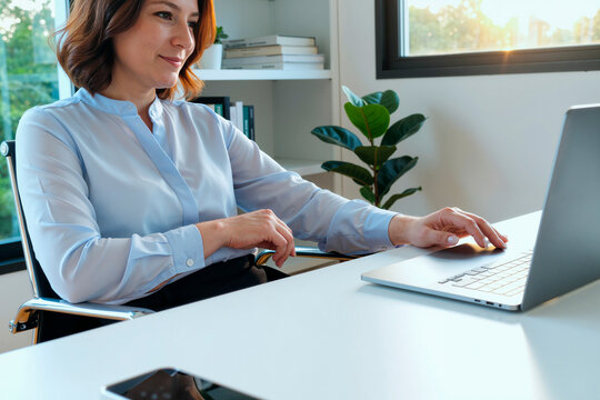Young adult woman with disability sitting in wheelchair, working at desk, using laptop and holding documents in modern home office with natural light coming through window