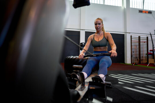 Athletic female intensely focused while working out on a rowing machine in a gym, demonstrating strength and endurance.