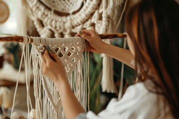Focused artisan carefully knotting and creating a macramé wall hanging, demonstrating the intricate art of textile knotting..