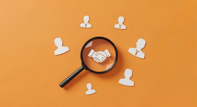 Magnifying glass focuses on a glowing business icon showing multiple paths representing career or market opportunity in a dimly lit setting.