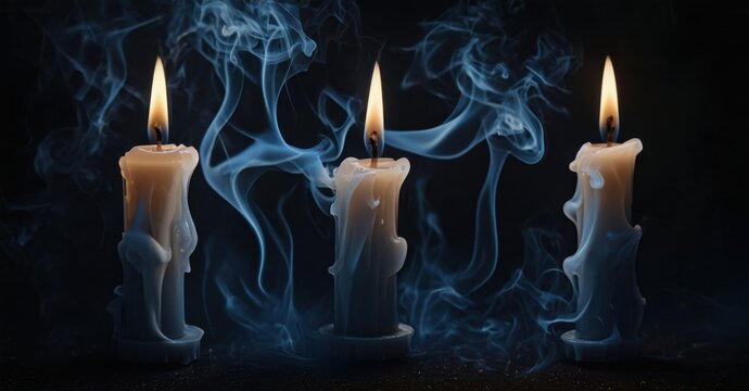 Burning candles emit smoke. Dark background emphasizes glowing flames, creating somber mood. Minimalist composition focuses on light, shadow.