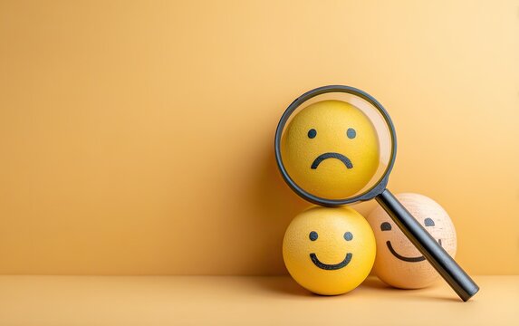 A magnifying glass focuses on a sad emoji, while happy emojis stand beside it on a pale orange background