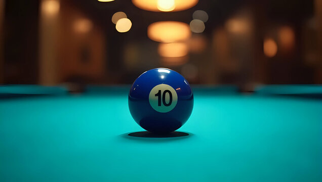 Closeup of blue number 10 billiard ball on green felt pool table, focus on ball, blurred bar with warm lighting background - game of pool, recreation, and nightlife concept