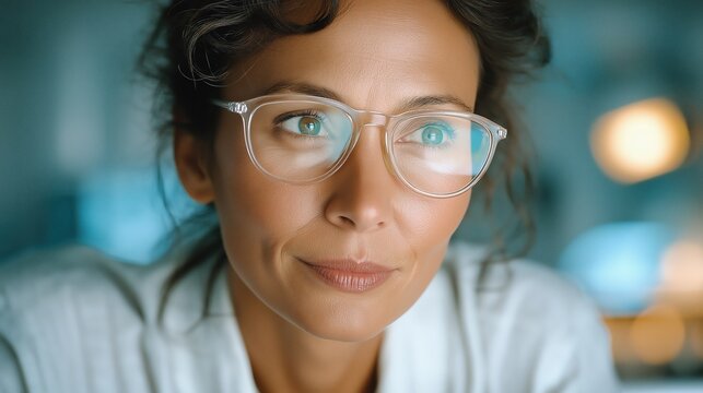A professional woman with glasses focusing on a computer screen at night. Close-up portrait with screen reflection in her eyewear. Business technology and concentration concept