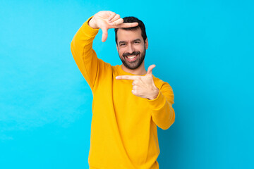 Young caucasian man over isolated blue background focusing face. Framing symbol