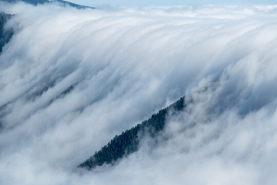 Waterfall like low level orographic clouds flowing down the steep north face of Karavanke Karawanken ridge with snow patches at sunset, Stol Hochstuhl peak Kranjska Slovenia Carinthia Austria Europe