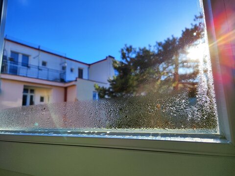 Single green plant in pot near fogged window with condensation and traces of moisture on frame. Damp glass surface and spathiphyllum leaves, humidity and home air imbalance. mold windows in apartment