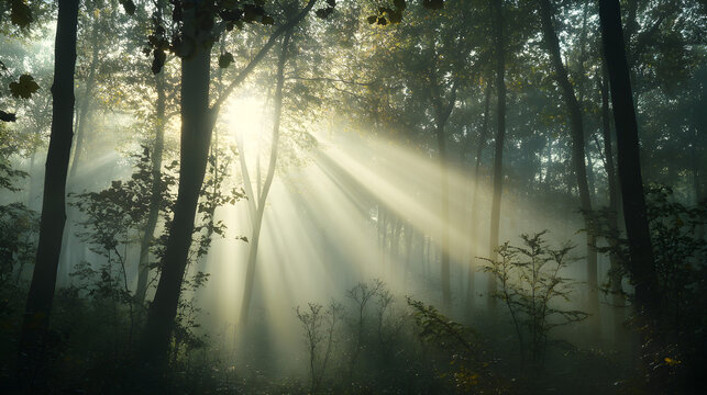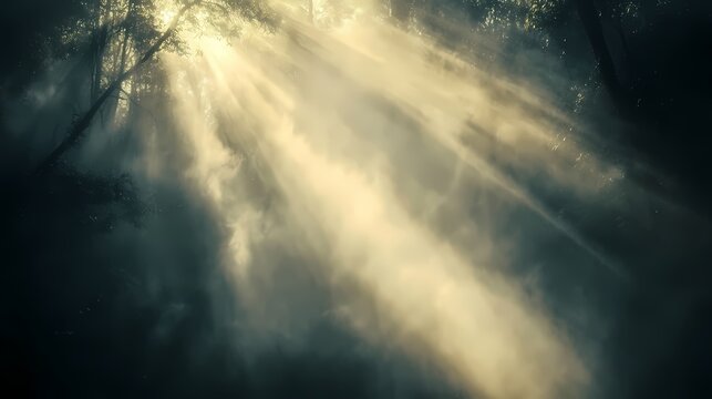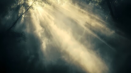 Light rays shining through a misty forest, creating an ethereal atmosphere