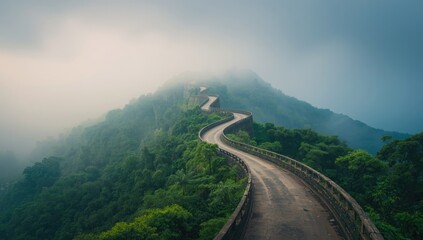 Foggy mountain road with waterfalls and lush greenery