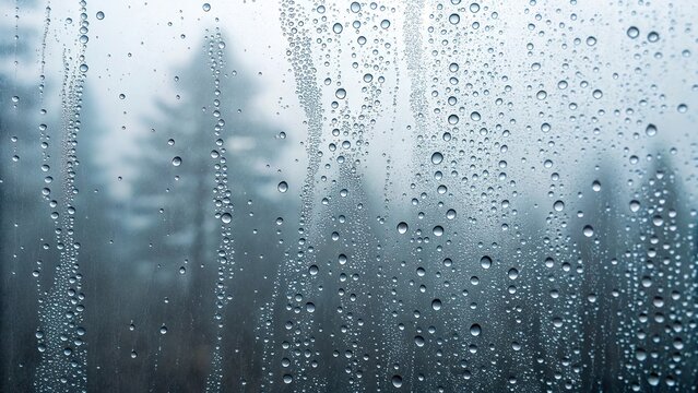 Macro shot of condensation forming on a cold beverage glass by the window during a rainy day