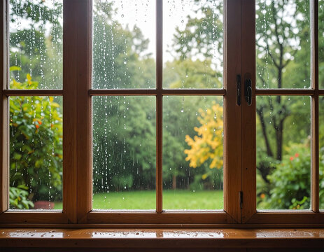 Window with condensation of steam after heavy rain. Bright morning sun in the window through the curtains. Texture or background photo, copy space