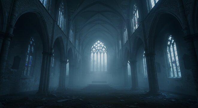 Eerie grim reaper strolling in foggy cemetry at dawn