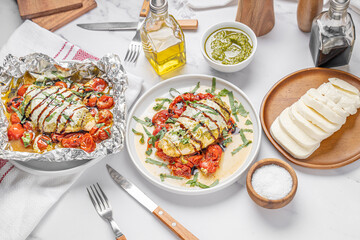 Foil packet dinner, chicken breast, potatoes and asparagus, closeup. AI