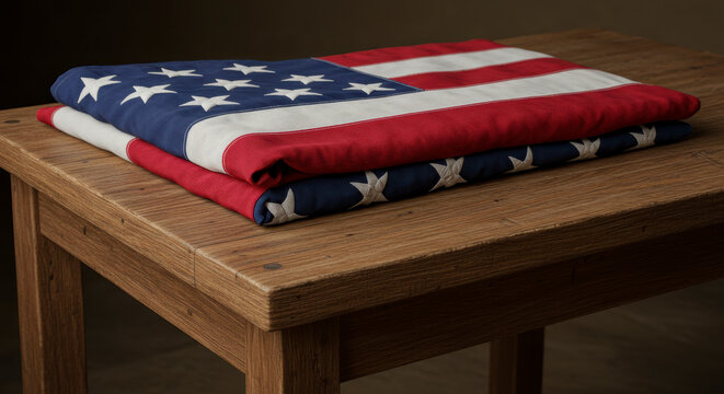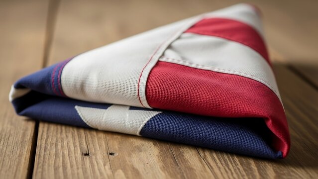 Folded American Flag on Wooden Surface - Symbol of Patriotism.