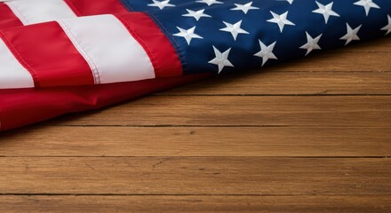 Gently folded American flag on a rustic wooden surface, evoking a sense of pride and solemnity for Memorial Day, copy space