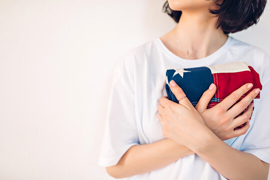 Elderly model holding a folded American flag against the heart, with a backdrop of a national monument.