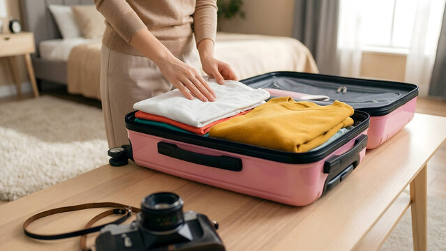 Close Up of Person Packing Clothes into Suitcase for Vacation Trip and Holiday Travel