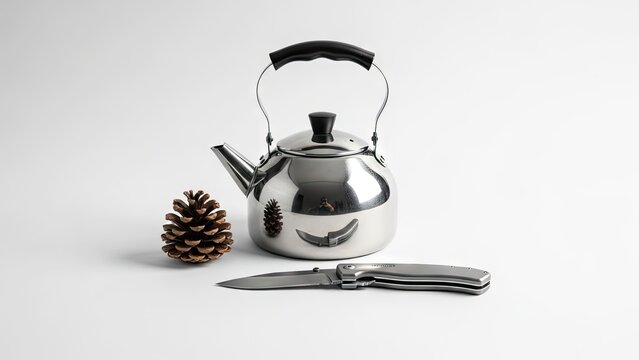 Shiny kettle, pinecone, and folding knife on white background