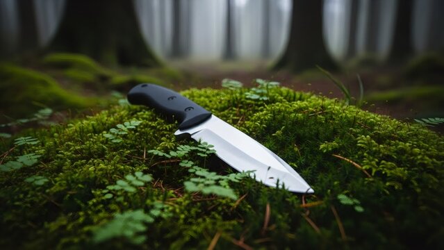 Tactical folding knife with a black handle resting on vibrant green moss covered in dewdrops. Outdoor adventure gear and nature exploration.