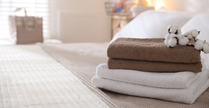 Stack of clean towels and cotton flowers on bed linens at home, closeup. Space for text