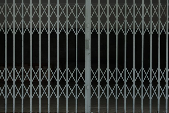 Closed folding steel door of the house, shop. Iron slide door of the home