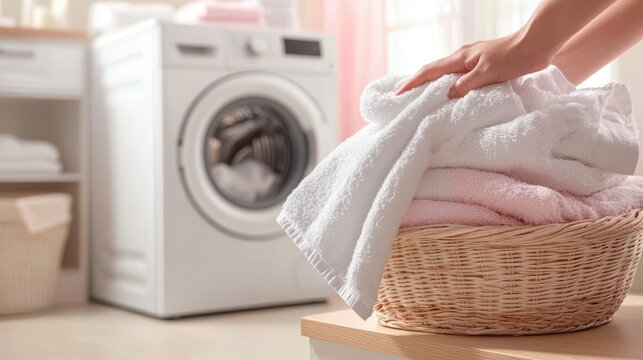 Young girl folding a clean towel in a linen closet. Child helping with household chores and laundry organization. Domestic life concept with copy space