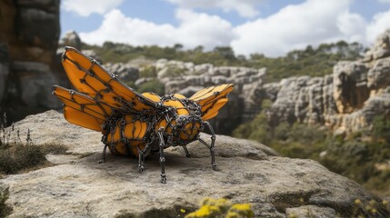 Iridescent butterfly perching on brass gear with translucent blue wings, macro closeup