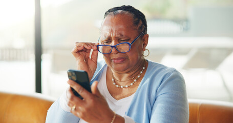 Old woman, glasses or struggle with phone reading, vision problem or small font size for difficulty. Sad, retirement or elderly person with poor eyesight to view mobile app, blurry text or aging eyes