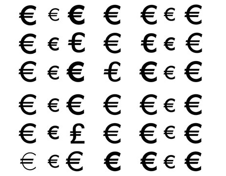 A grid arrangement of various sized financial symbols with a diverse size range and one different character