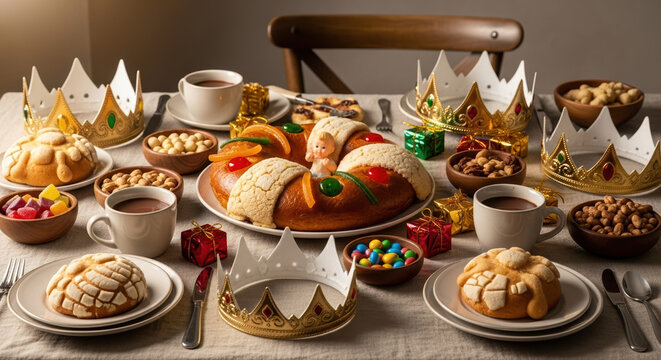 Día de los Reyes celebration with traditional Rosca de Reyes, showcasing holiday baked goods and festive crowns on dining table, preparing for Three Kings Day. Día de los Reyes, or Three Kings Day,