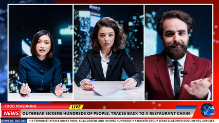 Virus outbreaks scares population, problem traced back to unsafe restaurant serving turned meals to clients. Expert show colleagues debating food poisoning problems, consumers protection.