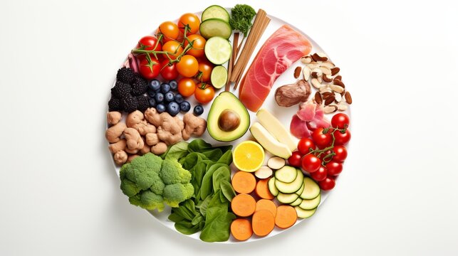 A healthy food pie chart that is isolated on a white background and includes food sources of carbohydrates, proteins, and fats in the correct proportions for diet, healthy eating, and