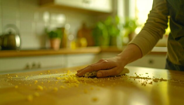 Woman's Hand Cleaning Kitchen Counter After Cooking Crumbs and Dough Scraps