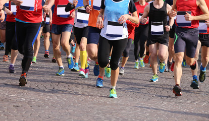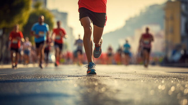 Running, motion and group of people on path together for marathon race, fitness and speed. Fast run team, urban runner club and racing in city street training workout with feet and legs on ground.