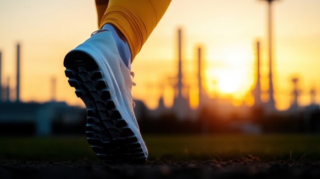 Silhouetted athlete runs with power in a stadium at sunset, embodying strength and determination under a glowing sky.