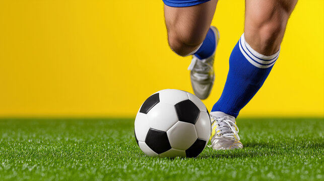 Soccer action on vibrant field with blue uniforms and yellow background
