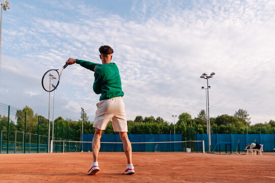 Tennis player practices backhand stroke on outdoor clay court