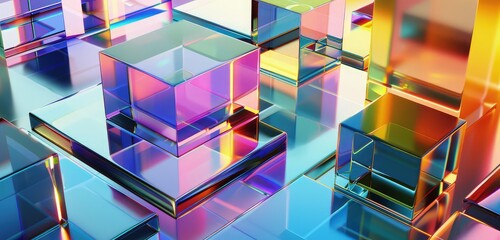 A detailed 3D rendering of gradient glasses and cubes, showcasing smooth transitions of vibrant colors and intricate light reflections on the glass surfaces.