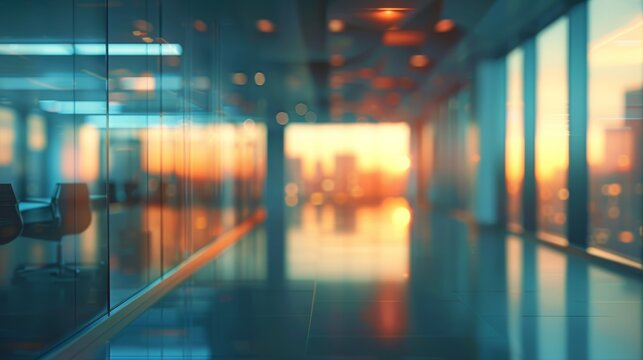 total blurred minimalist office, no people, panoramic windows and beautiful lighting, office, work, copy and text space, 16:9