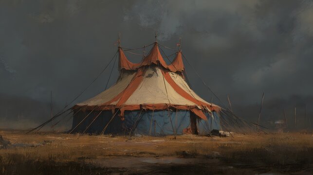 Dilapidated circus tent stands weathered and worn in a desolate, desolate landscape under a foreboding sky, showcasing a feeling of abandonment amidst dry, desolate terrain and a dramatic ambiance,...