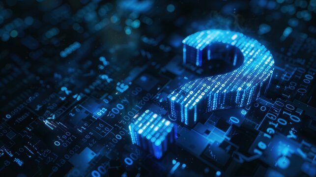 A radiant digital question mark symbolizes the inquisitive spirit of AI and blockchain.
