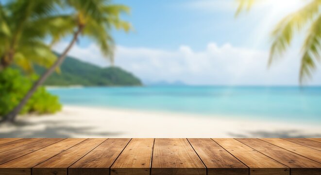 Empty wooden table top with a beautiful tropical beach and sunny sky background for display