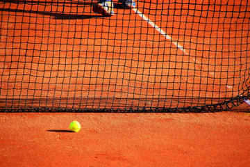 A blurred action shot of a player hitting a tennis ball with a racket.