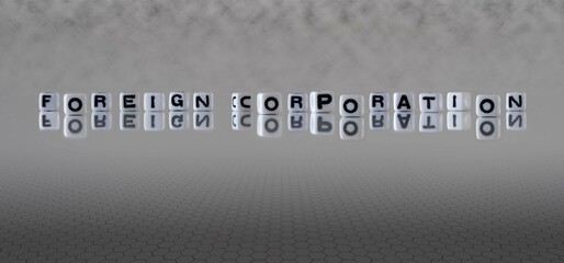 foreign corporation word or concept represented by black and white letter cubes on a grey horizon background stretching to infinity