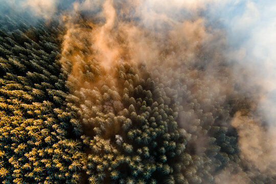 Autumn Tones of Aerial top view forest tree, Rainforest ecosystem and healthy environment concept and background, Texture of green tree forest view from above.