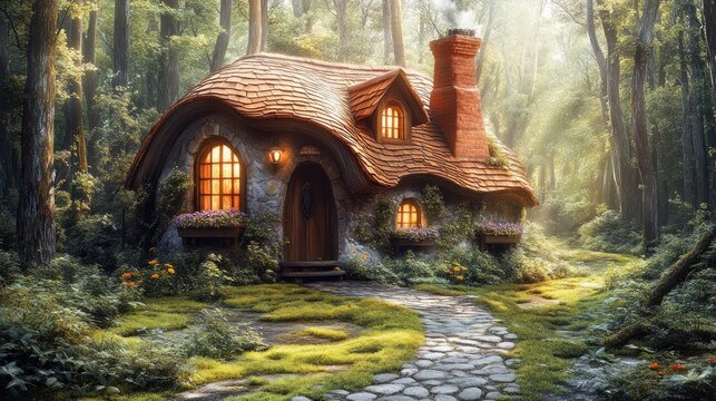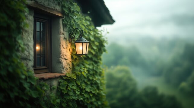 Cozy lantern illuminates ivy-covered cottage in serene forest during misty evening hours