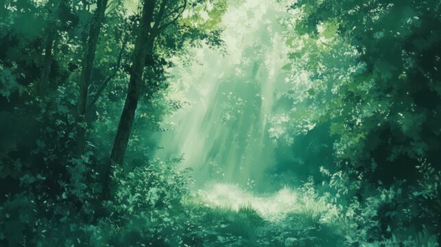 Mystical forest path, sunbeams, background trees, game design