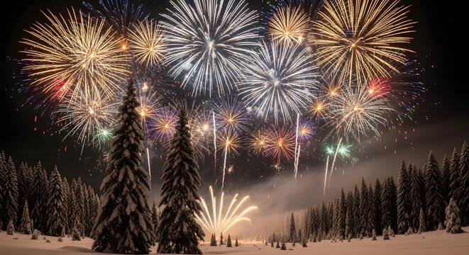 Fireworks over snowy forest at night.