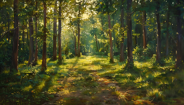 illustration of the dance of sunlight and shadow in a quiet forest glade